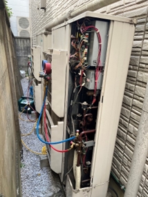 飲食店の解体現場にて業務用エアコンのフロン回収を行いました。外壁上部に室外機が固定されていたため、脚立を使用し作業しましたが、地面が平らではなく非常に不安定でした。 作業内容:フロン回収作業時間:約3時間 作業人数:1名